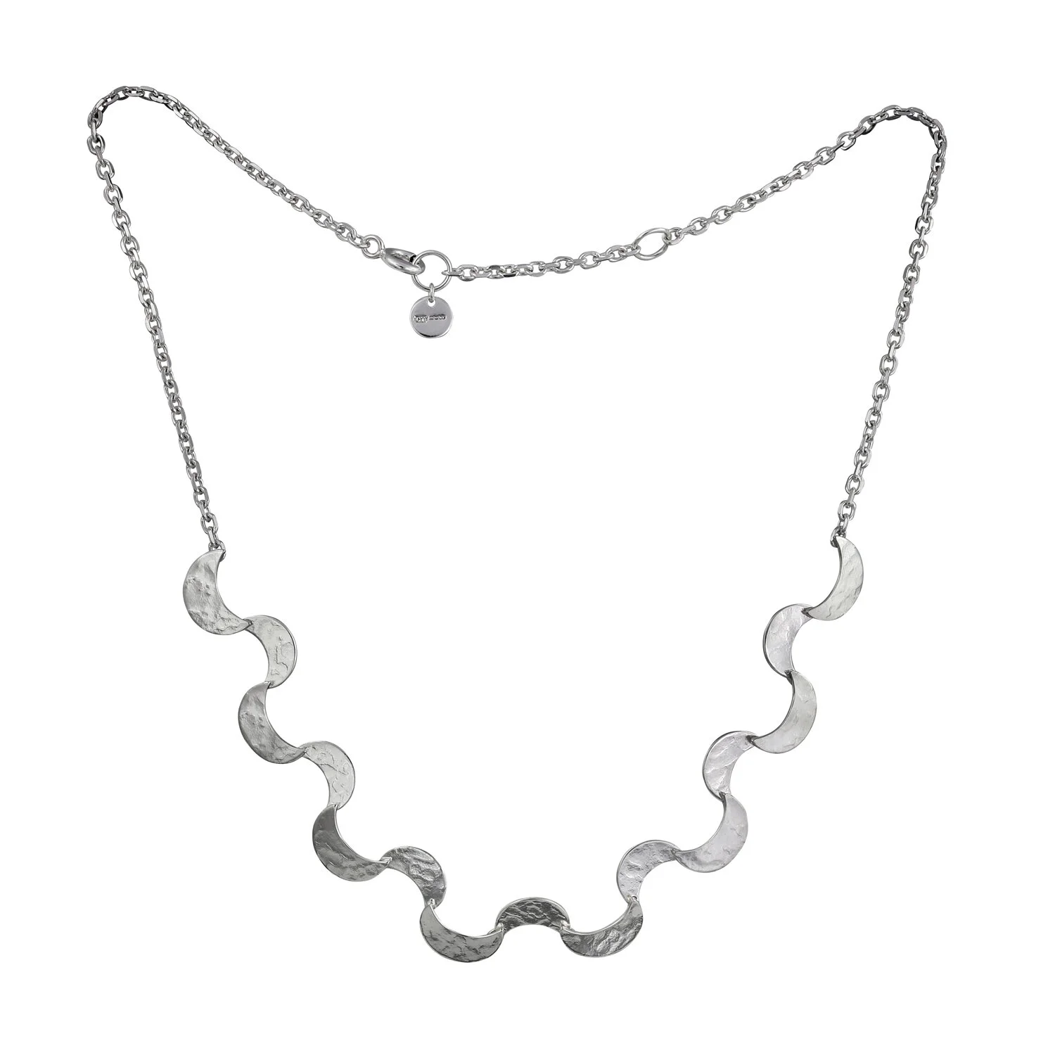 The Selene Ripple Necklace is formed of individual crescent shapes which are articulated into a fluid ripple pattern, inspired by the moons effect on the tides and ripples in water. This is a statement piece but could be dressed up or down. It is made from sterling silver and measures 1.5cm in width and 41cm/16” in length with a 2.5cm extender chain.